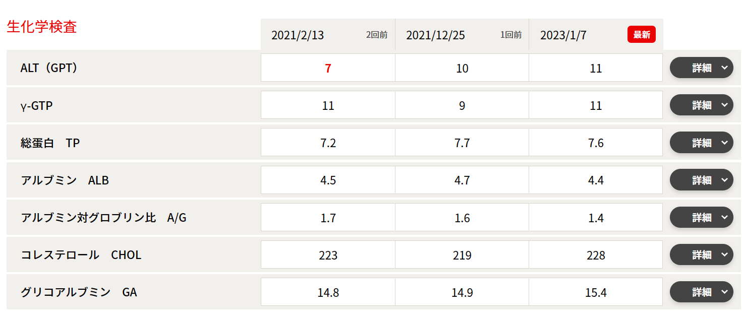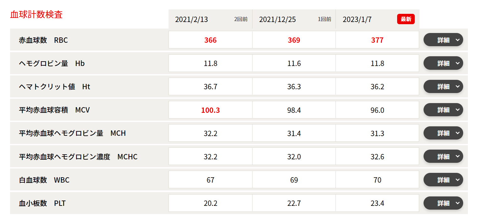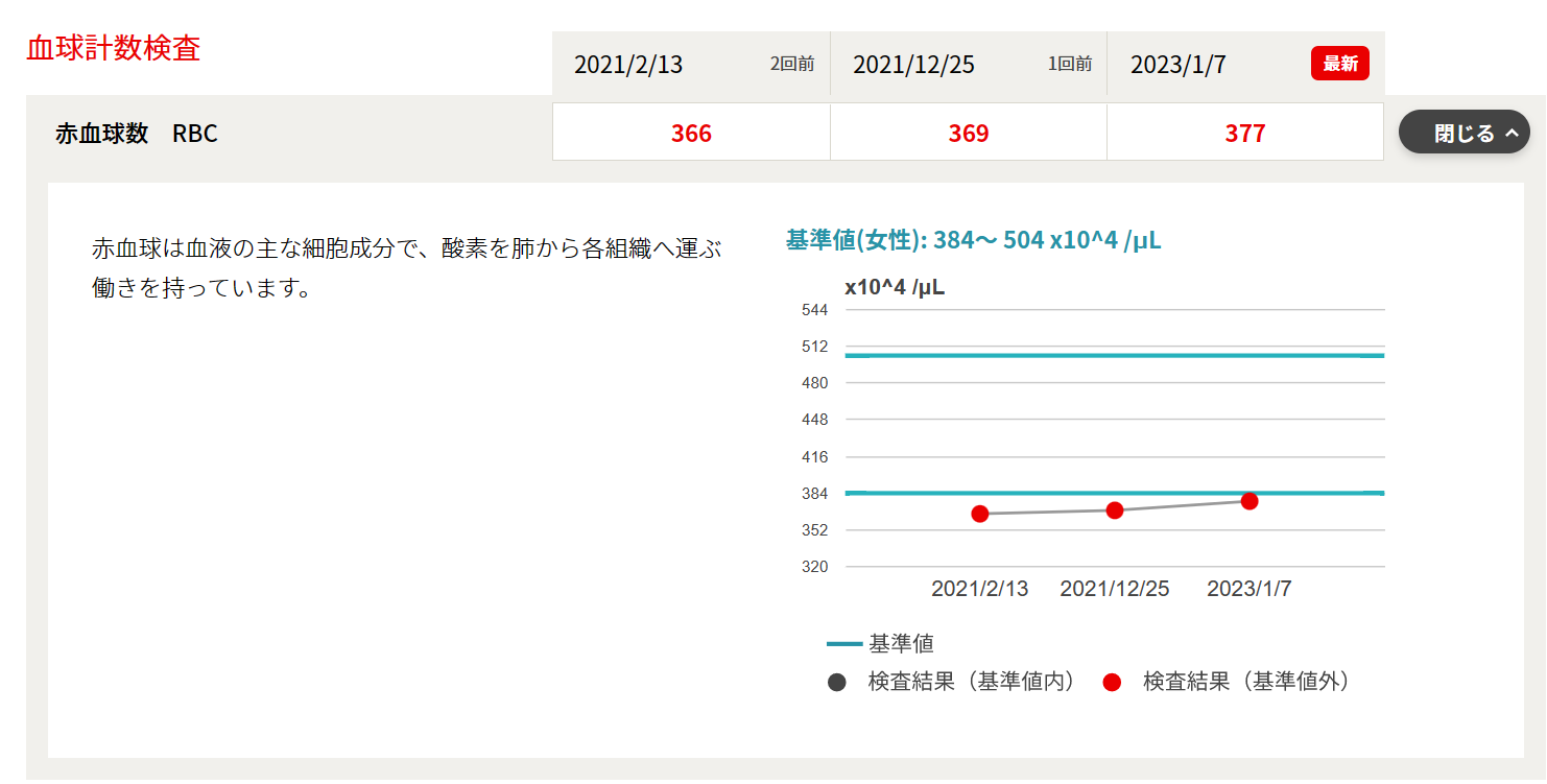 基準値を逸脱している数値は赤字で示されるのでチェックしやすいです。