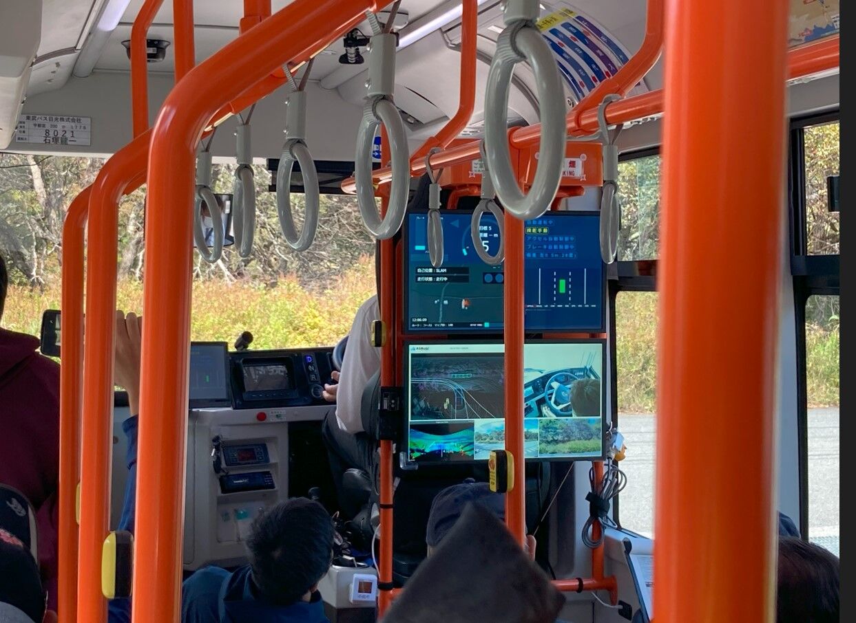 運転手さんが乗っていますが、実際はハンドルを動かしておらず、自動運転状態です。