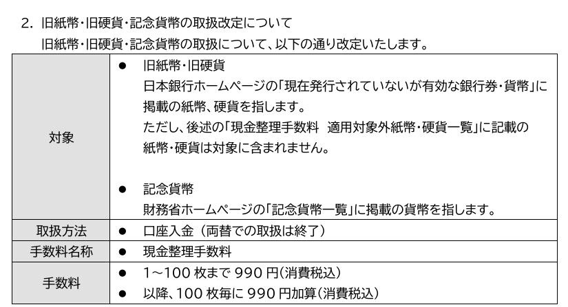 硬貨入金整理手数料及び旧紙幣・旧硬貨・記念貨幣の取り扱いについて