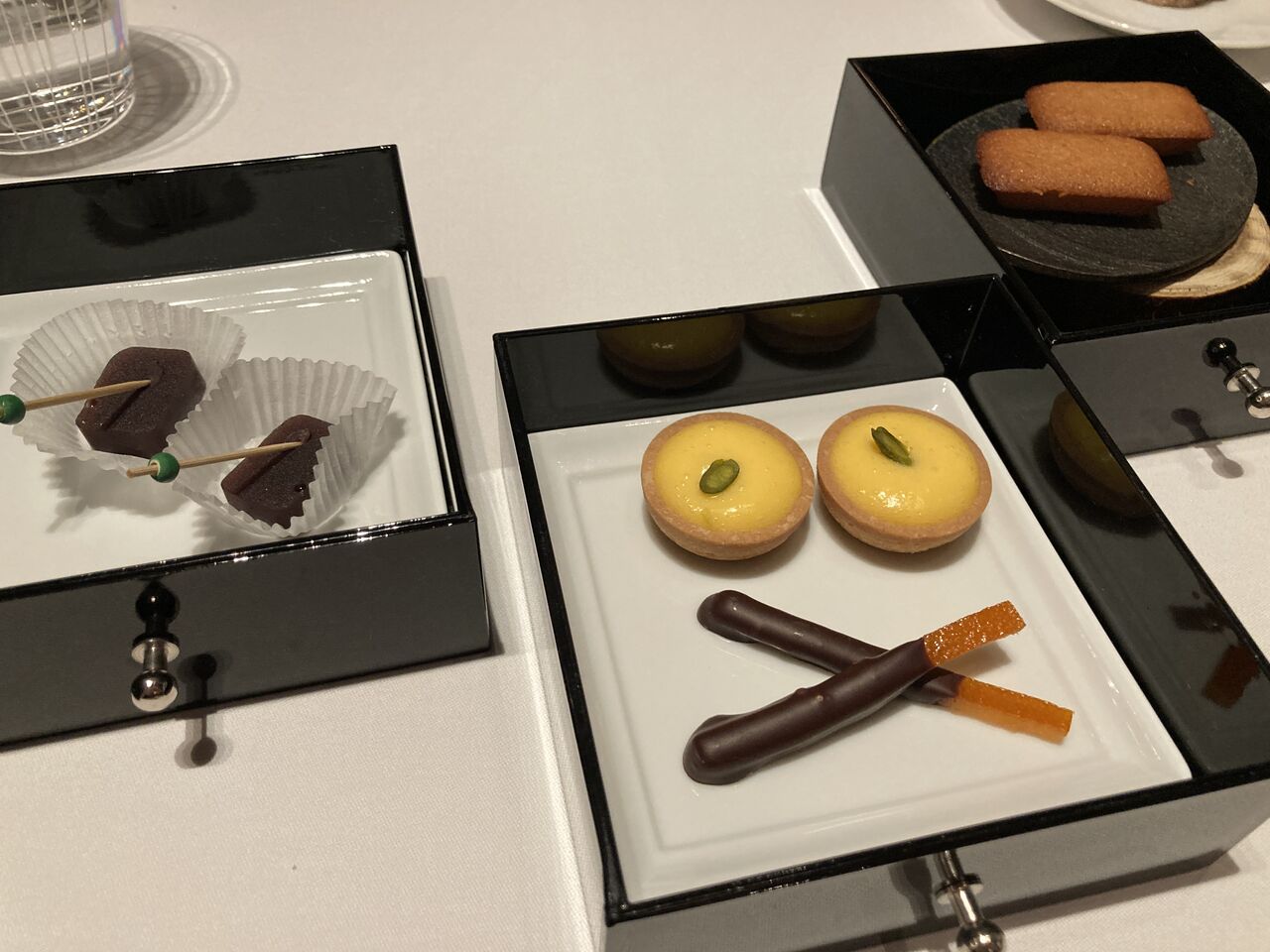 和三盆フィナンシェ、クリームとピスタチオのタルト(かな?)、オレンジピールチョコレート、虎屋の羊羹。