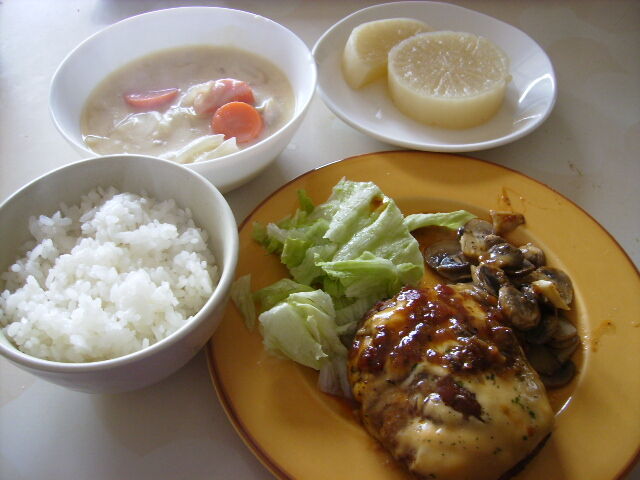 ふろふき大根とシチューはお手製ですが、ハンバーグは昨日買った出来合いのハンバーグです。
